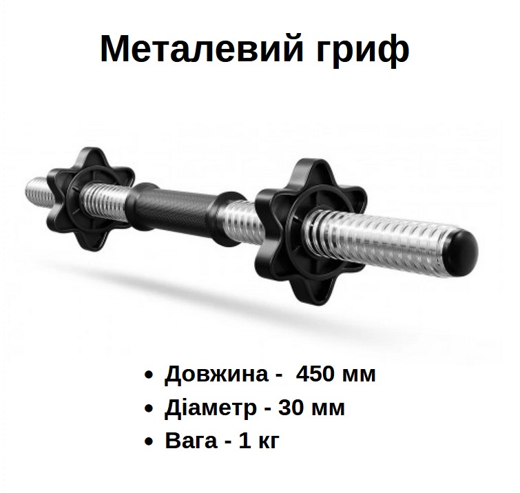Металевий гриф у місці обхвату рукою має пластикове покриття зі спеціальною насічкою. що забезпечує комфорт, унеможливлення ковзання в руці та уникнення потенційного травматизму в процесі виконання вправ